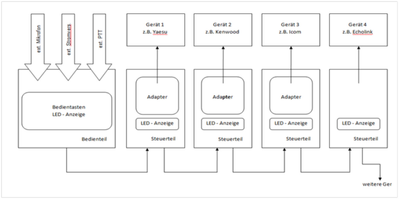 Die besondere Schwierigkeit war dabei, dass verschiedene Funkgeräte (z. B. Kenwood, YAESU, Icom oder auch andere) eine unterschiedliche Beschaltung